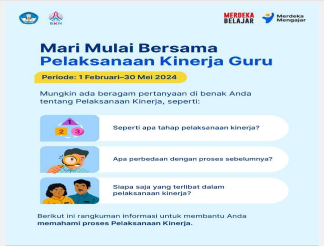 Bapak dan Ibu Guru, tahukah Anda bahwa tahap Pelaksanaan Kinerja telah dimulai? Tahap Pelaksanaan Kinerja telah berlangsung sejak 1 Februari hingga 30 Mei 2024. Namun, saat ini, mungkin masih ada beragam pertanyaan di benak Anda tentang Pelaksanaan Kinerja, seperti: