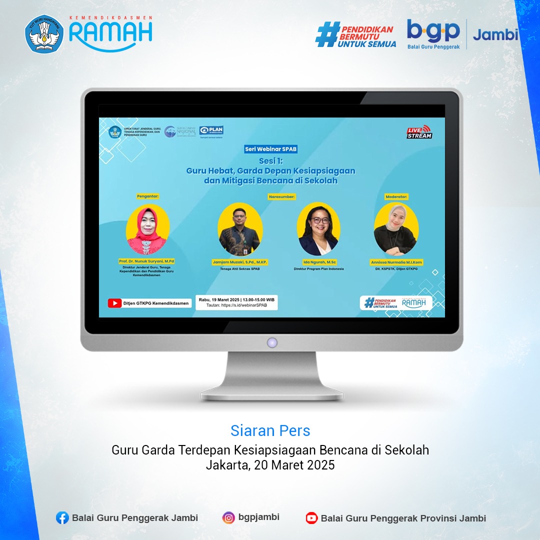 Jakarta, 20 Maret 2025 – Kementerian Pendidikan Dasar dan Menengah (Kemendikdasmen) melalui Direktorat Jenderal Guru, Tenaga Kependidikan, dan Pendidikan Guru (Ditjen GTKPG) bekerja sama dengan PLAN Indonesia meluncurkan seri webinar Satuan Pendidikan Aman Bencana (SPAB) pada Rabu (19/3). Seri pertama webinar ini bertema “Guru Hebat, Garda Terdepan Kesiapsiagaan dan Mitigasi di Sekolah”. Program ini bertujuan meningkatkan kesiapsiagaan sekolah dalam menghadapi bencana serta memperkuat peran guru dalam mitigasi dan penanggulangan risiko di lingkungan pendidikan.
