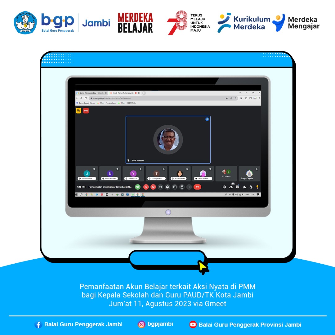 Balai Guru Penggerak (BGP) Provinsi Jambi menyelenggarakan via Gmeet mulai Jumat (11/08//2023) mulai pukul 13.30 WIB s/d selesai, dengan peserta Guru PAUD/TK dan Kepala Sekolah se Kota Jambi. Webinar dibuka langsung Kepala Balai Guru Penggerak Provinsi Jambi Bapak Budi Hartono, S.Pd., M.Pd. Kegiatan dimoderatori oleh Anis Nurjanah, S.Pd. Sesi diawali dengan pemaparan materi oleh Romi Aries, SH, MH selaku Koordinator IKM, dilanjutkan oleh Ibu Sonya Olyvia, S.Pd, M.Pd. (Sub Koordinator Pelaksana IKM) dan Ibu Asmayanti Achmad, S.Pd., M.Pd. (Kurator video NS BPB). Diharapkan dengan mengikuti kegiatan ini peserta dapat meningkatkan aktivitas penggunaan PMM terutama di lingkup PAUD/TK Kota Jambi.