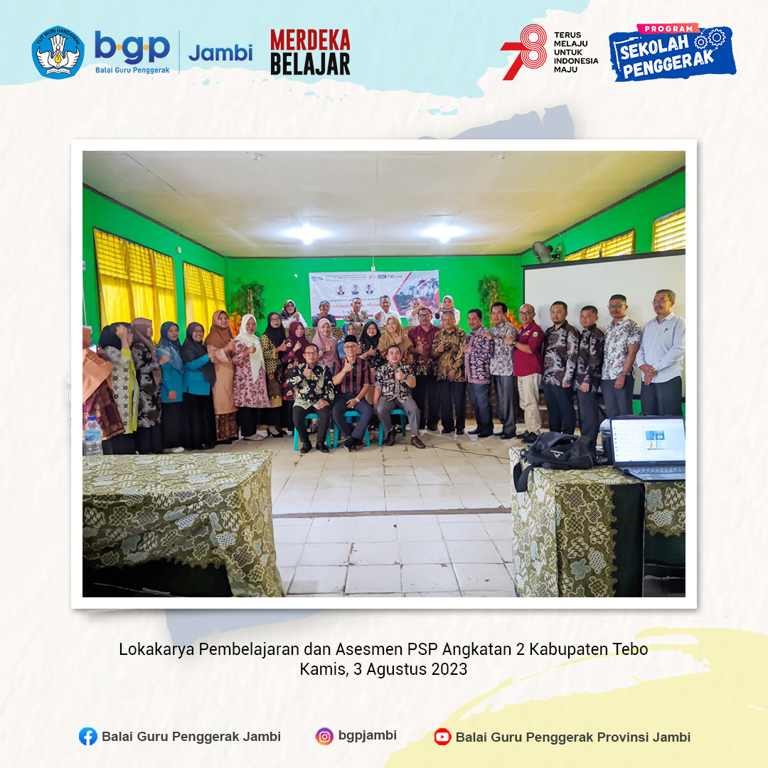 Kamis (03/08/2023) Balai Guru Penggerak (BGP) Provinsi Jambi melaksanakan Lokakarya Kurikulum Pembelajaran dan Asesmen Program Sekolah Penggerak (PSP) Angkatan 2 Kabupaten Tebo bertempat di SMP Negeri 1 Tebo Provinsi Jambi. Dalam acara pembukaan hadir serta memberi pengarahan Sekretaris Dinas Pendidikan Kabupaten Tebo Bapak Supriyadi, S.Pd, MM yang mewakili Bapak Kepala Dinas Pendidikan Kabupaten Tebo. Kegiatan yang merupakan Program dari Balai Guru Penggerak (BGP) Provinsi Jambi diikuti Peserta sebanyak 81 orang dari unsur Kepala Sekolah, Pengawas dan Guru yang difasilitasi oleh 3 orang Fasilitator Sekolah Penggerak pendampingnya yang bertujuan untuk meningkatkan kompetensi kepala sekolah dan guru dalam mengimplementasikan Kurikulum Merdeka pada Satuan Pendidikan. Setelah mengikuti Lokakarya ini diharapkan guru dapat melaksanakan aksi nyata yaitu membuat modul ajar yang sudah mengintegrasikan rencana asesmen awal pembelajaran dan pembelajaran terdiferensiasi, sedangkan Kepala Sekolah dapat memberikan dukungan trerhadap guru untuk melakukan asesmen awal dan pembelajaran terdiferensiasi.