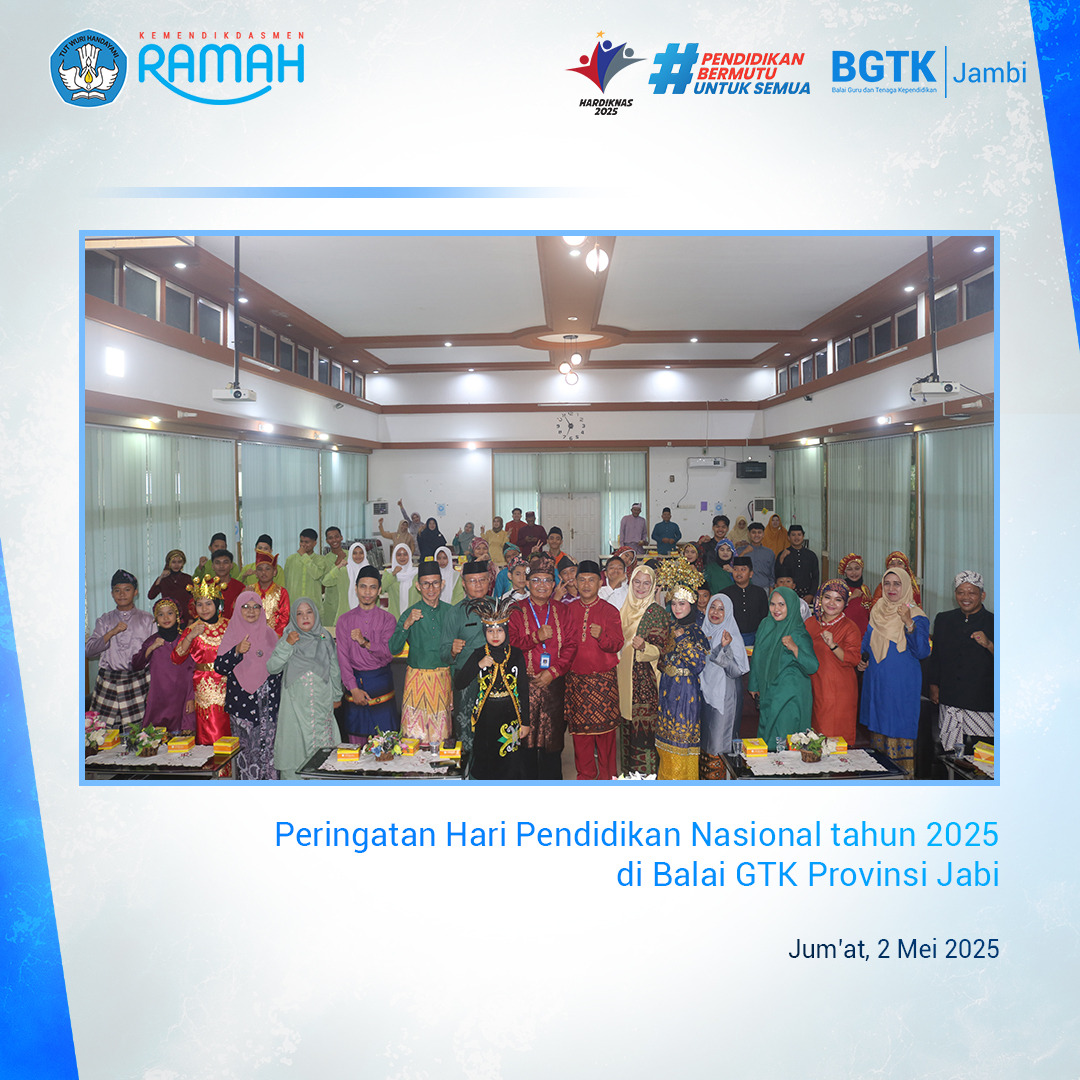 Upacara Peringatan Hari Pendidikan Nasional tahun 2025 dengan Tema “ Partisipasi Semesta Wujudkan Pendidikan Bermutu Untuk Semua “ , peringatan ini menjadi momentum untuk meneguhkan dan memperkuat tekad serta komitmen dalam memajukan pendidikan nasional. Upacara ini dilaksanakan pada hari Jumat (02/05//2025) di halaman Kantor Balai Guru dan Tenaga Kependidikan (BGTK) Provinsi Jambi yang diikuti oleh seluruh Pegawai BGTK Provinsi Jambi beserta siswa SD, SMP, SMA dan SMK dari Kabupaten Batang Hari dengan memakai pakaian adat tradisional. Bertindak selaku Pembina Upacara adalah Kepala Balai GTK Provinsi Jambi, Bapak Budi Hartono, S.Pd. M.Pd. Dalam sambutannya, Kepala BGTK membacakan Pidato Menteri Pendidikan Dasar dan Menengah Republik Indonesia bahwa sesuai amanat konstitusi, pendidikan nasional berfungsi untuk mengembangkan kemampuan, membentuk watak, serta mewujudkan peradaban bangsa yang bermartabat, dalam rangka mencerdaskan kehidupan bangsa.