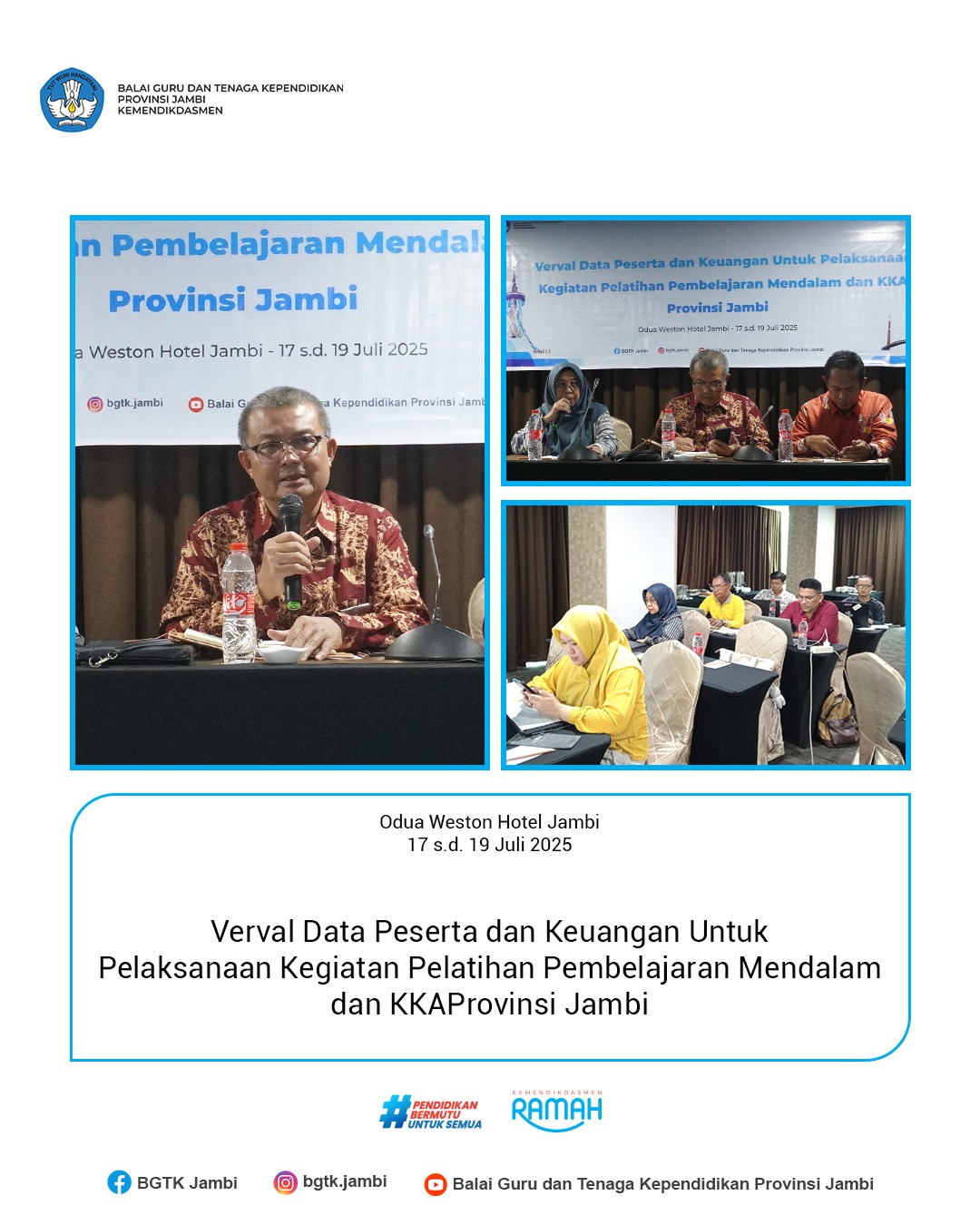 Dalam rangka mendukung kelancaran pelaksanaan Pelatihan Pembelajaran Mendalam dan Koding Kecerdasan Artifisial Provinsi Jambi Tahun 2025, Balai Guru Tenaga Kependidikan (BGTK)Provinsi Jambi melaksanakan kegiatan Verifikasi dan Validasi (Verval) data peserta dan keuangan pada tanggal 17 hingga 19 Juli 2025 bertempat di Hotel Odua Weston Jambi.